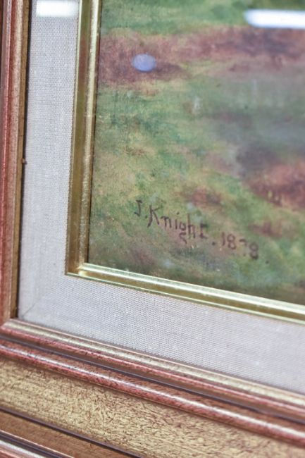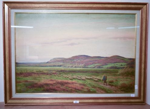Joseph Knight (British 1837-1909) watercolour, droving sheep within a rural landscape, signed and dated 1878 lower left, within a gilt moulded frame, under glass 53cm x 79cm & 68cm x 94.5cm overall. Foxing.
