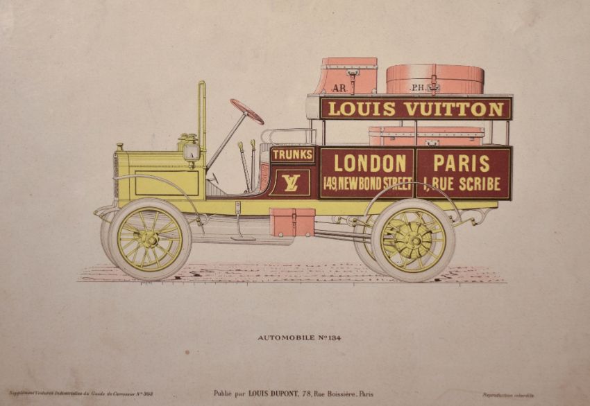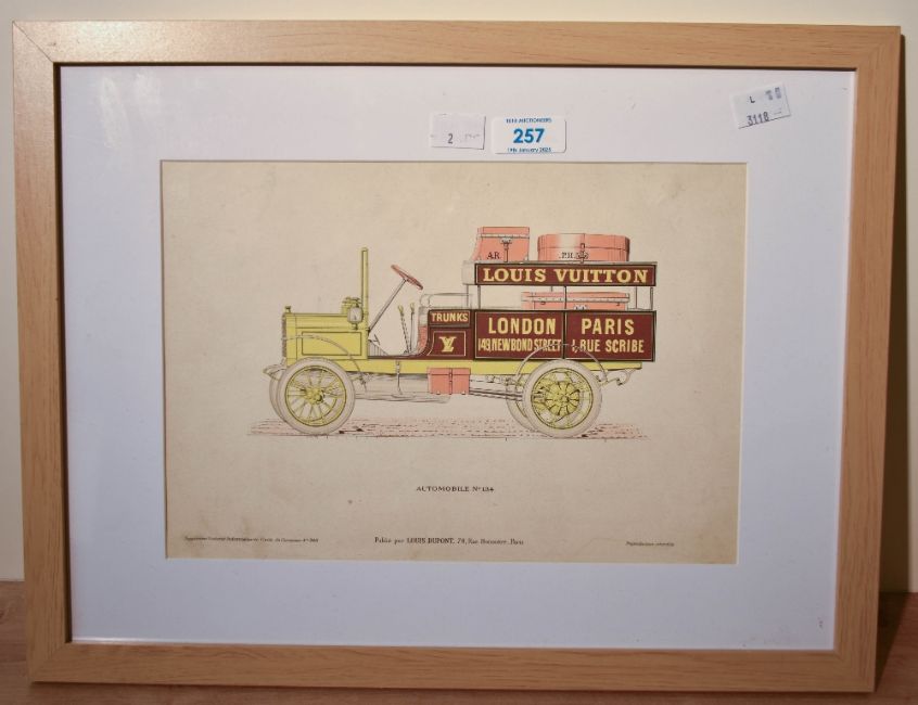 Artist unknown, 20th century colour print showing a Louis Vuitton delivery car, in white mount, beach frame, under glass. 20cm x 28.5cm 33cm x 43cm overall.