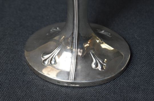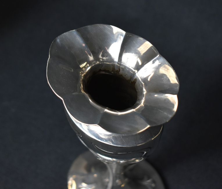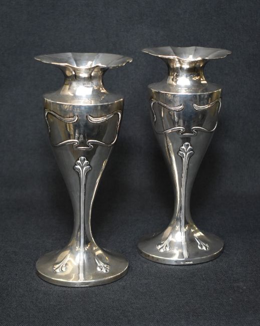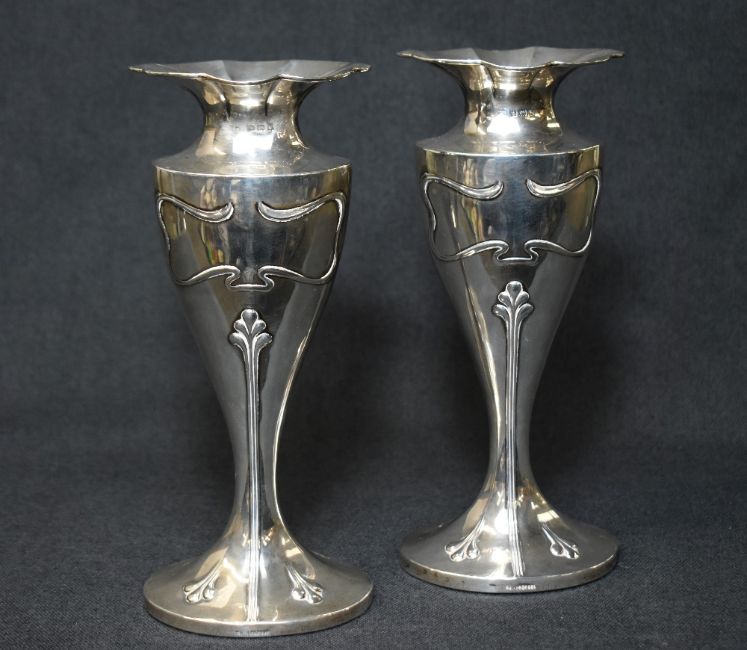 A pair of Edwardian silver vases, of oval fluted form having a lobed floral motif rim with embossed Art Nouveau style decoration, raised on a filled oval foot, marks for Birmingham 1906, maker probably Charles Horner, 22.5cm, 713g gross filled