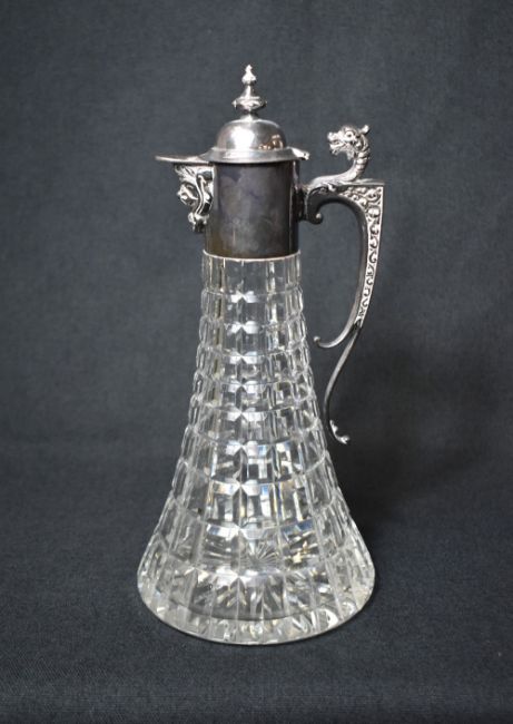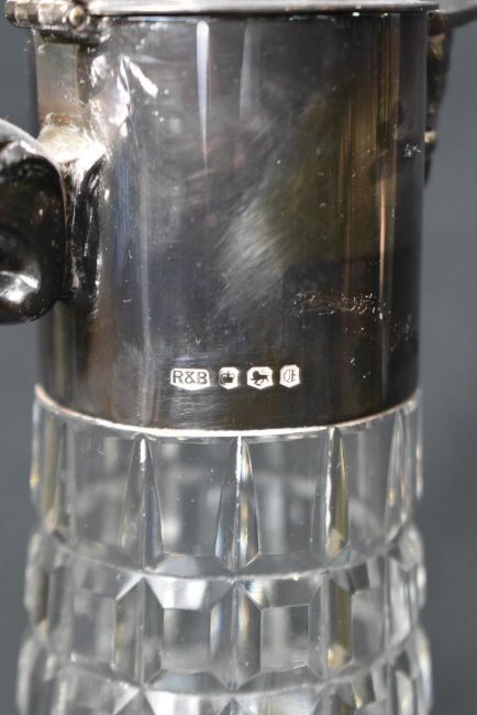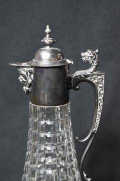 An Elizabeth II silver mounted cut glass decanter, the finial topped cap to the mount with a short narrow spout having embossed scroll work, opposed by an ornate scroll handle with a dragons head to the top and embossed scroll decoration to the sides, marks for Sheffield 1973, maker Roberts & Belk Ltd, 32cm
