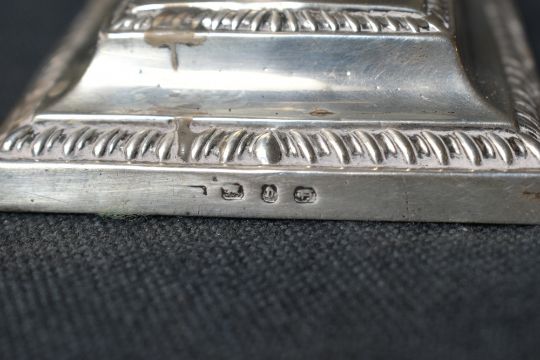 A pair of Victorian silver Corinthian column candlesticks, having concave square detachable sconces with gadrooned trim, embossed decoration on filled moulded square step bases having gadrooned trim, marks for Birmingham, possibly 1895, rubbed makers mark, 15cm. One does not sit flat due to filled base being dislodged
