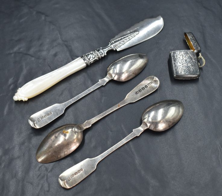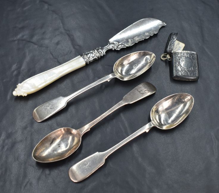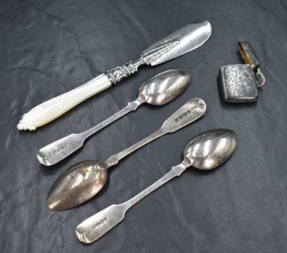 A Victorian silver butter curler knife, having decorative scroll work to the blade, embossed decoration to the ferrule and a mother-of-pearl handle, marks for Sheffield 1852, maker Aaron Hadfield, along three silver fiddle pattern spoons, all with engraved monograms and a silver vesta case having engraved decoration, marks to include London, Exeter and Chester, 1830, 1865 and 1908, makers WB, Thomas Hart Stone and Smith & Bartlam, 110g gross