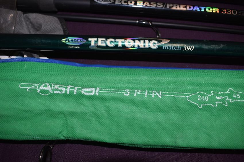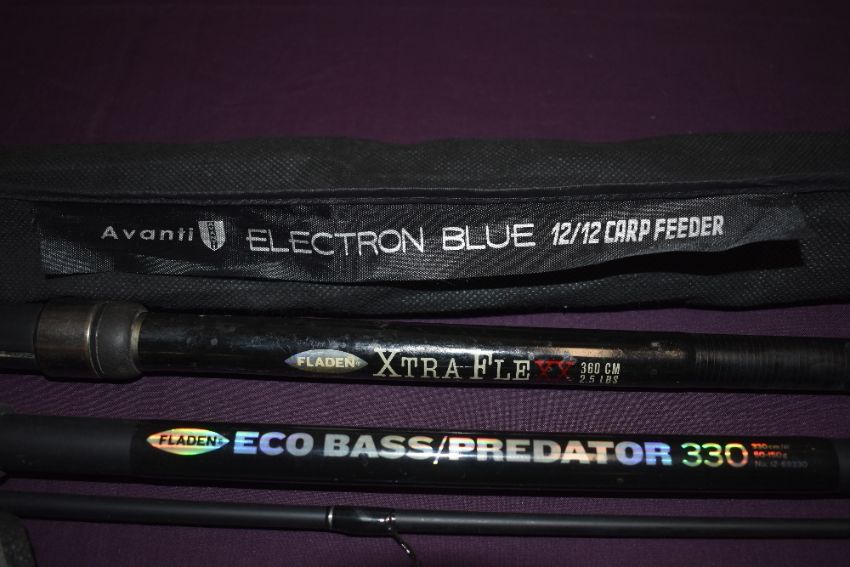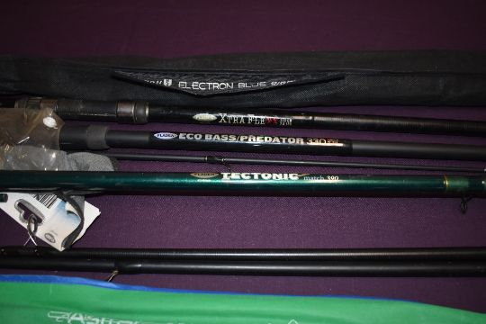 A collection of 5 course fishing rods including an Xtra flexx by Fladen. A Fladen Eco bass predator, a Fladen tectonic 3.9m An Avanti Electron Blue carp feeder and an Astral Spin
