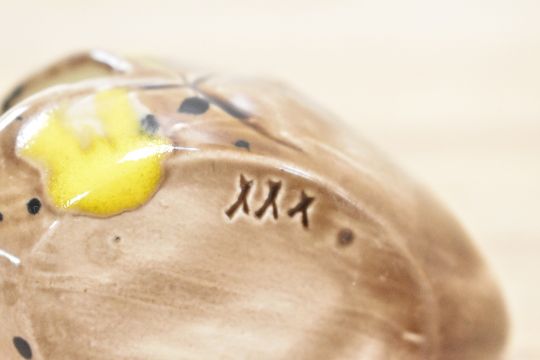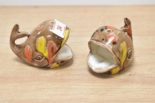 A pair of unusual vintage Japanese ceramic ash trays in the form of a whale, hand painted on a brown glaze ground, h5.5cm.