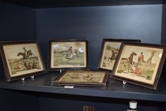 A set of 5 vintage equestrian framed prints, depicting characterful fox hunting scenes, h18cm x w22cm.