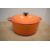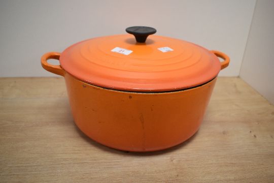 A large cast iron Le Creuset casserole dish with lid in volcanic orange colour, w30cm.