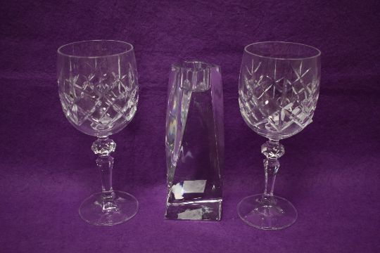 A Swedish Orrefors glass candle holder in the Tornado design, measuring 16cm high, together with a pair of Bohemian crystal wine glasses, with boxes