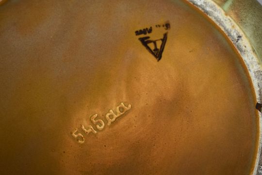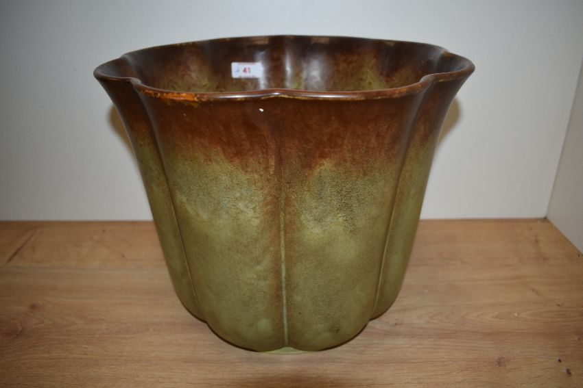 A 20th Century German lobed jardiniere, covered in a dripped green/brown glaze with maker's mark to the underside, measuring 26cm high