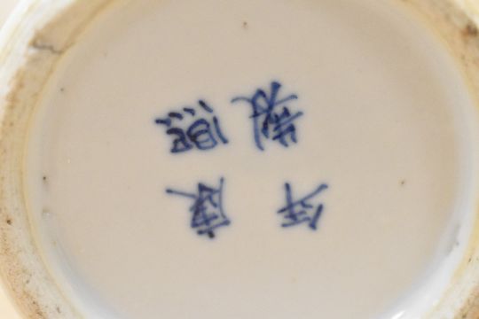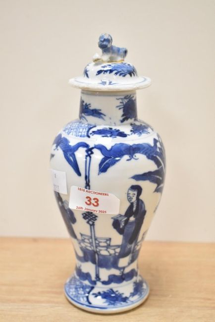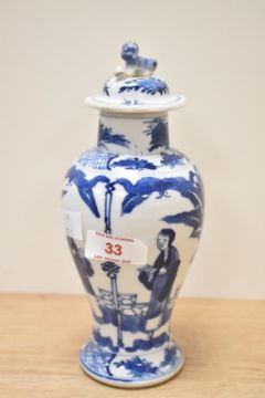A 19th century Chinese blue and white lidded baluster vase, the lid with foo dog finial, the body decorated with figures amongst a garden scene, four character marks to base, h20cm.