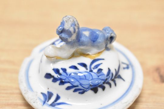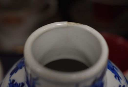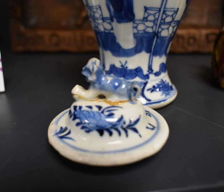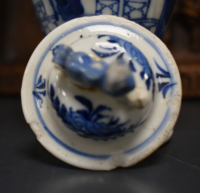 Condition report: Damage and repair to the vase lid and finial. Chips to the lid rim. On close inspection a hairlin crack can be seen to the inside and outside of the neck.