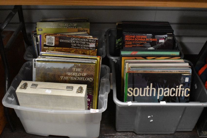 4 boxes of 12' and 7' mixed genre records, to include South Pacific, Best of British Brass, The Land of Smiles, Rubinstein ect, over 65 +.