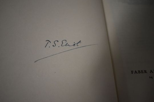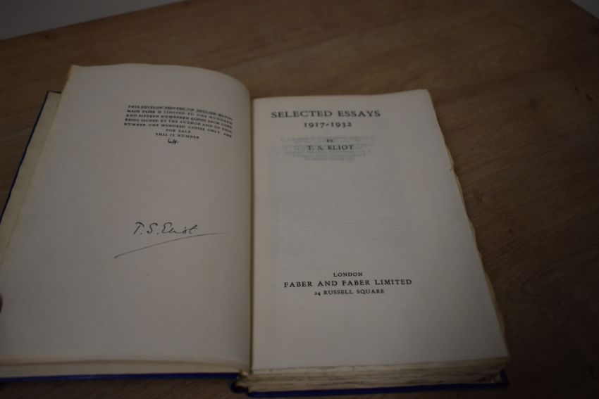 Signed Limited Edition. Eliot, T. S. - Selected Essays 1917-1932. London: Faber and Faber, Ltd. 1932. Limited edition of 115 copies, this being no.64. Signed by T. S. Eliot. Original binding. Printed on hand-made paper. (1)