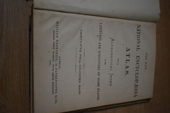 Atlas. The New National Encyclopaedia Atlas. With an Alphabetical Index of the Latitudes and Longitudes of 30,000 Places. London: William Mackenzie, 1868. With 29 of 35 maps. Lacking back-strip, boards being held in place by sticky-back plastic covering. A 'breaking' copy. (1)