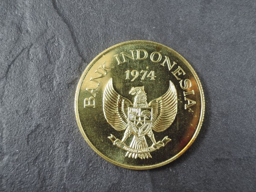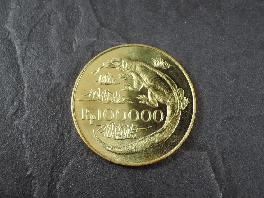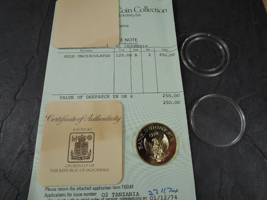A 1974 Bank of Indonesia 100,000 Rupiah Gold Coin, Kamodo Dragon to reverse, Uncirculated in plastic capsule with Royal Mint certificate, weight 33.6g, .900 Fine Gold, part of the Conservation Coin Collection sold by Spinks, No 1 of the collection of 24 Gold Coins with Advice note dated 1974
