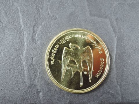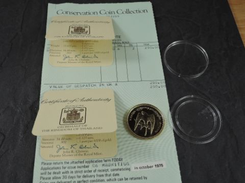 A 1974 Thailand 5000 Bahts Gold Coin, White-eyed River Martin to reverse, Uncirculated in plastic capsule with Royal Mint certificate, weight 33.6g, .900 Fine Gold, part of the Conservation Coin Collection sold by Spinks, No 5 of the collection of 24 Gold Coins with Advice dated 1975