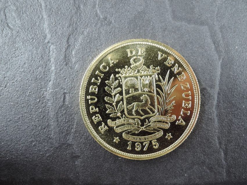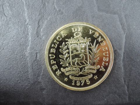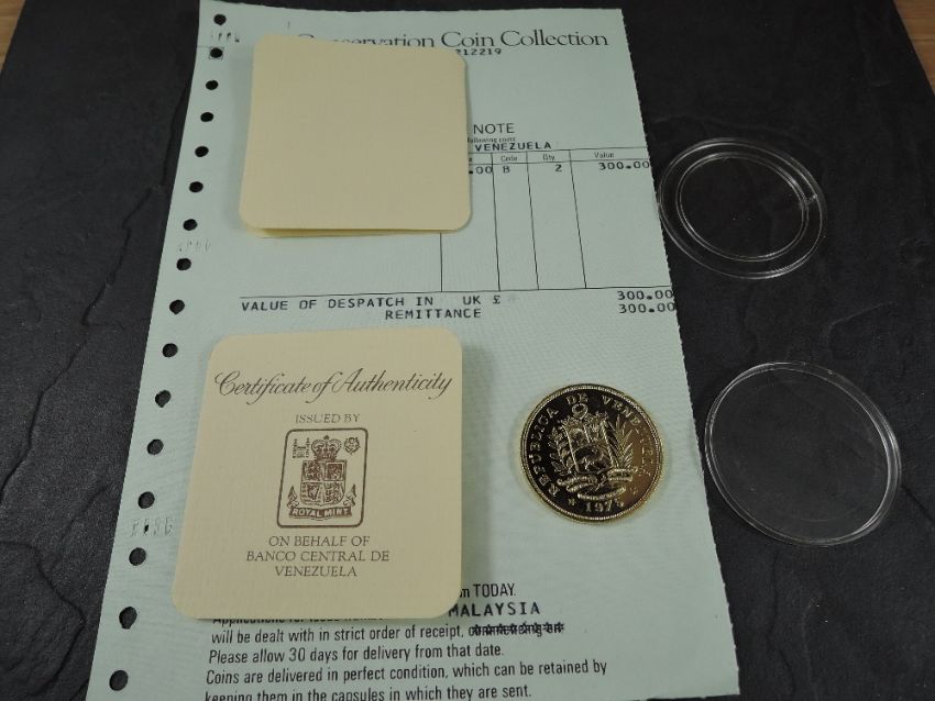 A 1975 Republica De Venezuela 1000 Bolivares Gold Coin, Bird on branch to reverse, Uncirculated in plastic capsule with Royal Mint certificate, weight 33.7g, .900 Fine Gold, part of the Conservation Coin Collection sold by Spinks, No 7 of the collection of 24 Gold Coins, with Advice note without date