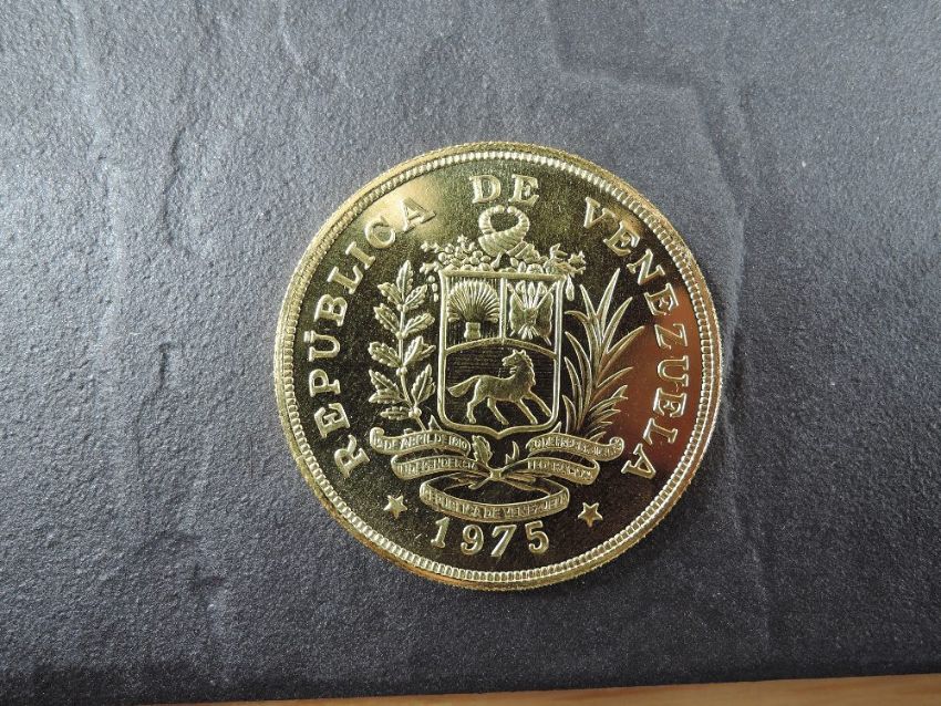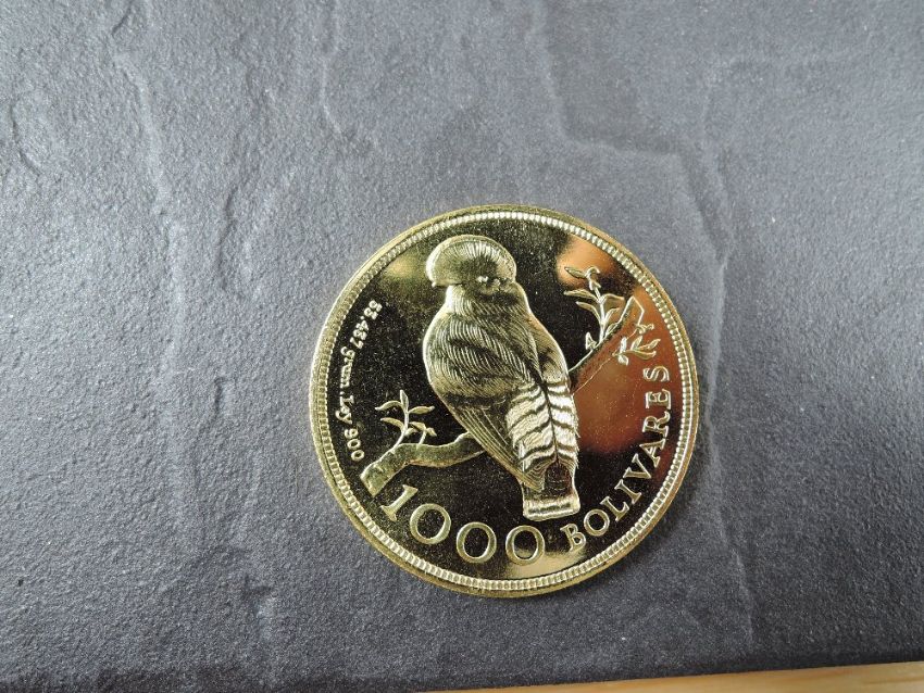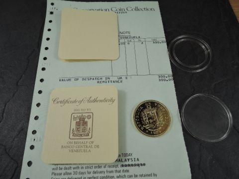 A 1975 Republica De Venezuela 1000 Bolivares Gold Coin, Bird on branch to reverse, Uncirculated in plastic capsule with Royal Mint certificate, weight 33.7g, .900 Fine Gold, part of the Conservation Coin Collection sold by Spinks, No 7 of the collection of 24 Gold Coins, with Advice note without date