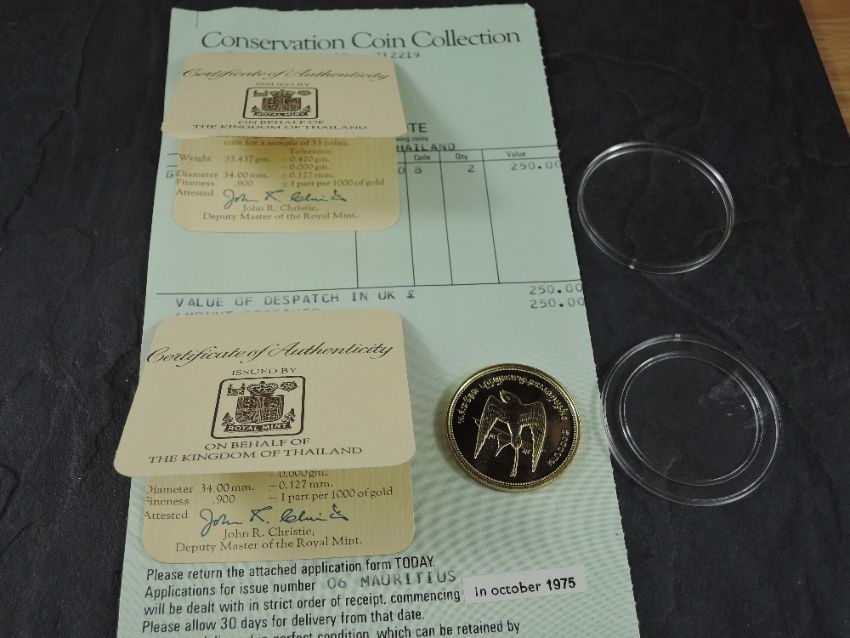 A 1974 Thailand 5000 Bahts Gold Coin, White-eyed River Martin to reverse, Uncirculated in plastic capsule with Royal Mint certificate, weight 33.6g, .900 Fine Gold, part of the Conservation Coin Collection sold by Spinks, No 5 of the collection of 24 Gold Coins with Advice dated 1975