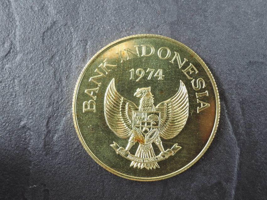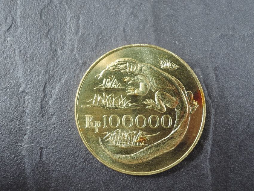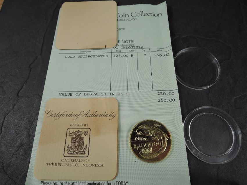 A 1974 Bank of Indonesia 100,000 Rupiah Gold Coin, Kamodo Dragon to reverse, Uncirculated in plastic capsule with Royal Mint certificate, weight 33.6g, .900 Fine Gold, part of the Conservation Coin Collection sold by Spinks, No 1 of the collection of 24 Gold Coins with Advice note dated 1974