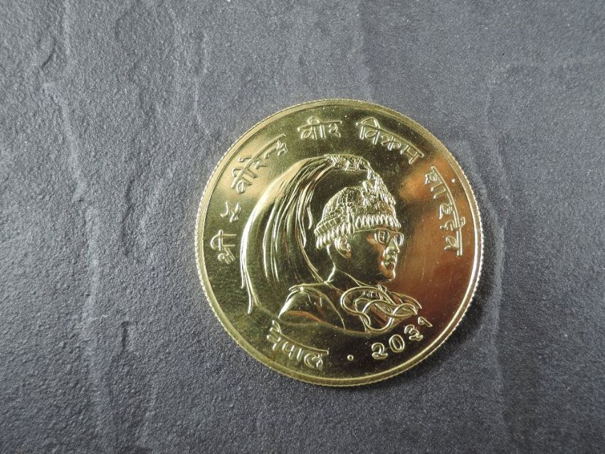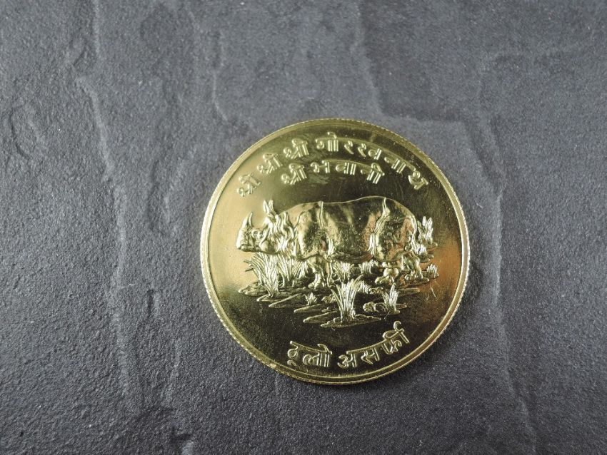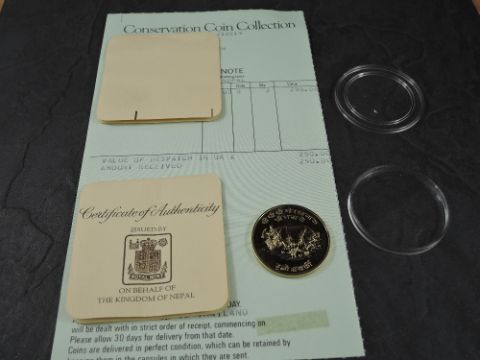 A 1974 Nepal Large Asarphi Gold Coin, Great Indian Rhinoceros to reverse, Uncirculated in plastic capsule with Royal Mint certificate, weight 33.6g, .900 Fine Gold, part of the Conservation Coin Collection sold by Spinks, No 4 of the collection of 24 Gold Coins with Advice note with no date