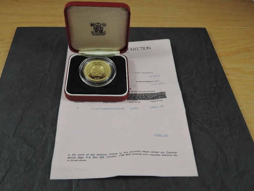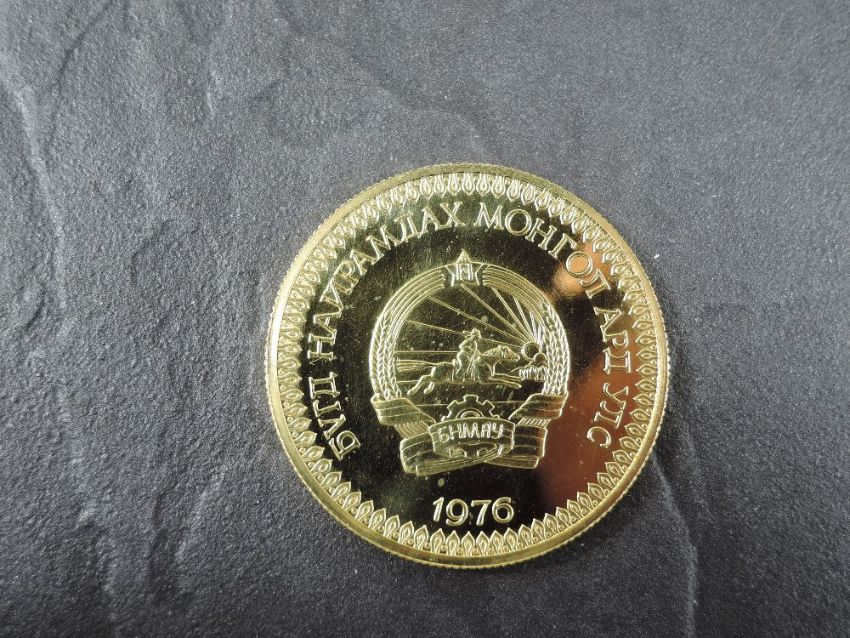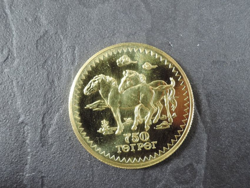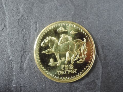 A 1976 Mongolia 750 Togrog Gold Coin, Przewalski Horses to reverse, Uncirculated in plastic capsule and fitted case, with Royal Mint fitted case, no certificate, weight 33.7g, .900 Fine Gold, part of the Conservation Coin Collection sold by Spinks, No 10 of the collection of 24 Gold Coins, with Advice note date 1976