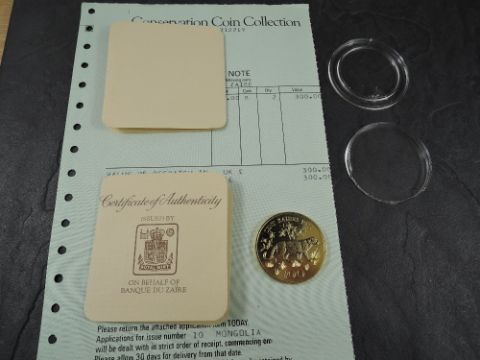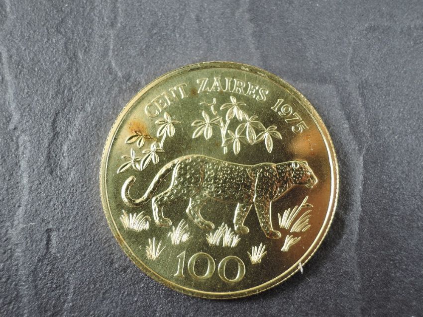 A 1975 Banque Du Zaire 100 Zaires Gold Coin, Leopard to reverse, Uncirculated in plastic capsule with Royal Mint certificate, weight 33.7g, .900 Fine Gold, part of the Conservation Coin Collection sold by Spinks, No 9 of the collection of 24 Gold Coins, with Advice note without date