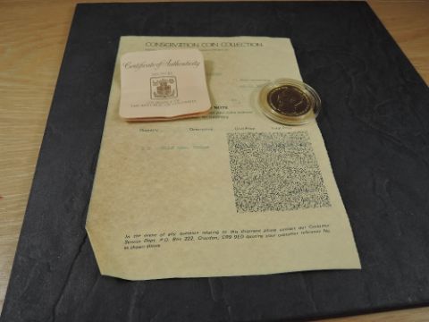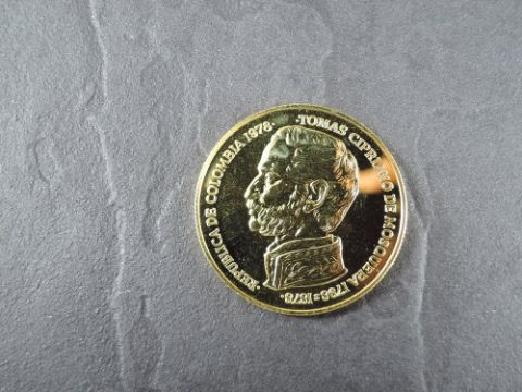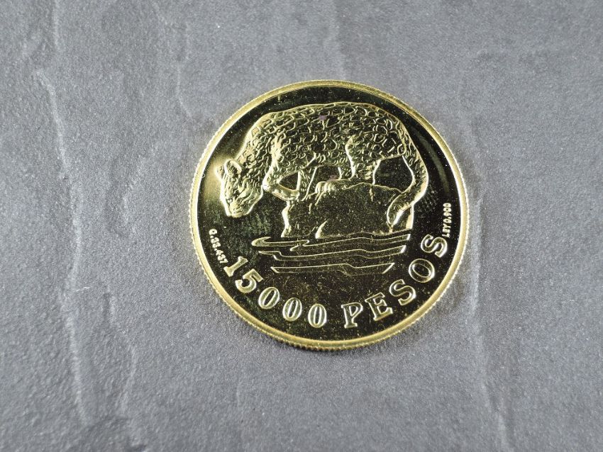 A 1978 Colombia 15000 Pesos Gold Coin, Ocelot near a body of water to reverse, Uncirculated in plastic capsule, with Royal Mint certificate, No case, weight 33.7g, .900 Fine Gold, part of the Conservation Coin Collection sold by Spinks, No 19-24 of the collection of 24 Gold Coins, with Advice note dated 1979