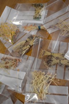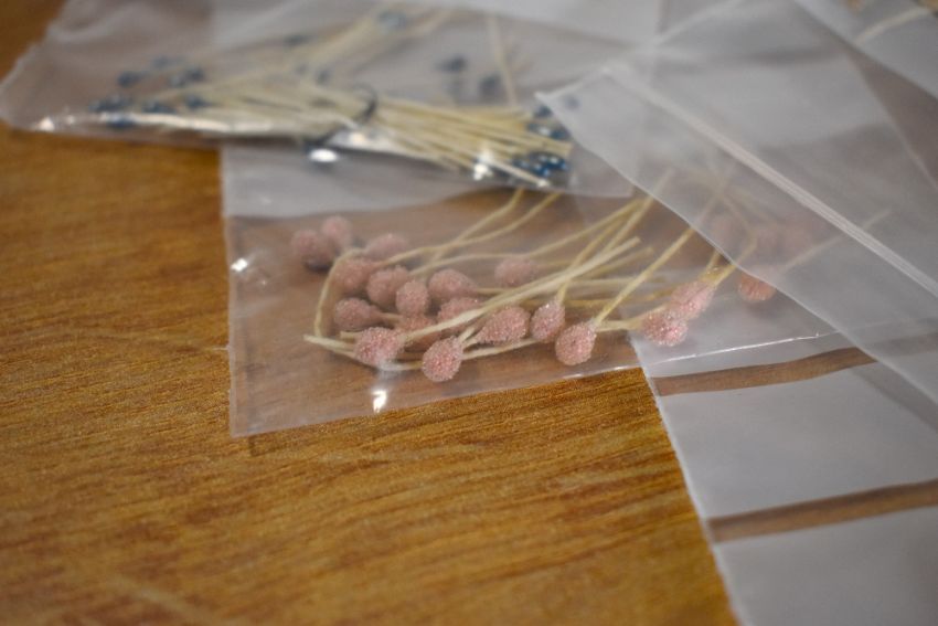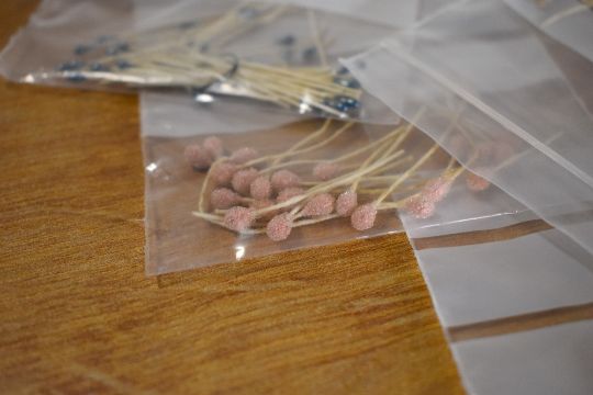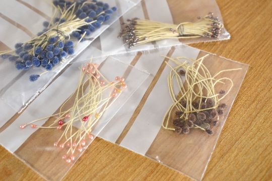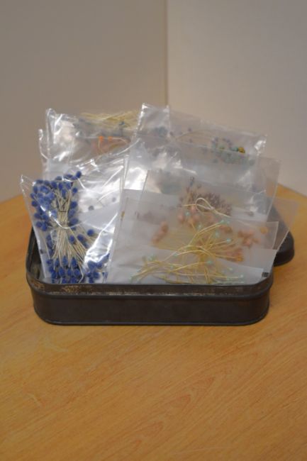 A quantity of vintage flower stamens, beaded and embroidered in various colours, sizes and materials, attached as they are to cream thread ties, for craft use, millinery and ribbon flower making, wreath making, headdress and clothing ornamentation. Approximately 300 individual stamens.