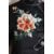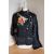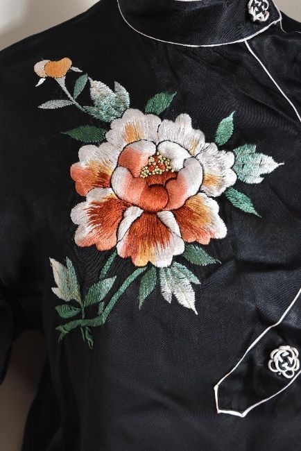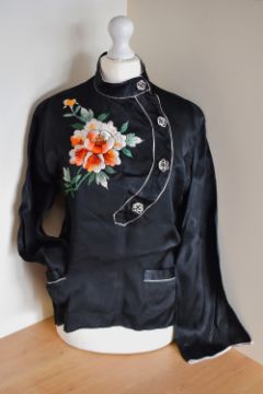 A set of vintage pyjamas in black satin with Chinese inspired 'oriental' details, such as a Mandarin collar and a large embroidered flower motif at the shoulder, having an asymmetric popper closure, with wide leg trousers, size S, measuring 17' across top of the shoulders.