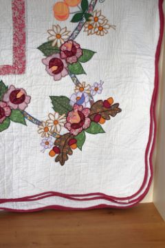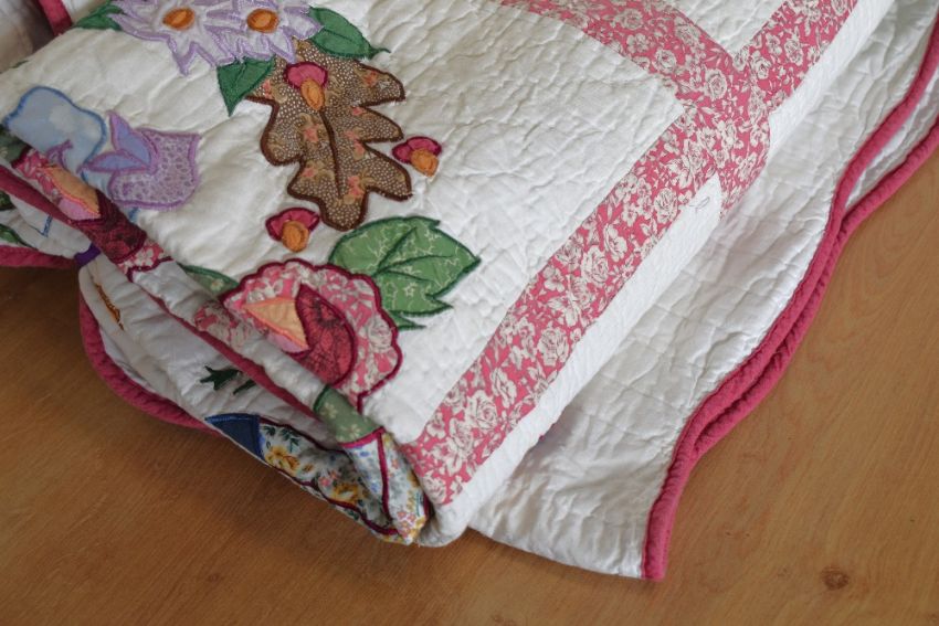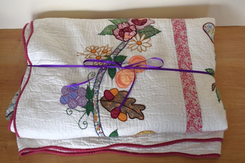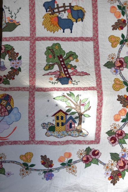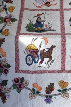 A 20th century limited edition quilt, numbered 111 of 200 editions, having an over all Mandalay quilting, burgundy trim scalloped hem, and featuring extensive and complex applique work depicting an array of 'cottage-core' themed subjects: fruit, oak leaves, mushrooms, farm work and animal scenes, hot air balloons and floral motifs, constructed using pink, green, blue and yellow chintzy and traditional floral patterned fabrics. 100% cotton exterior and interior padding.