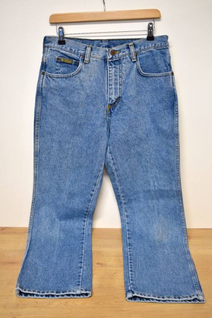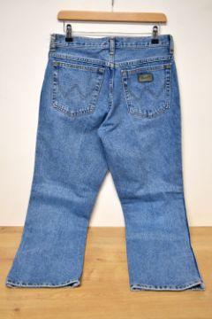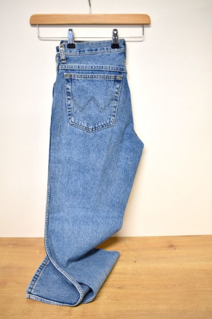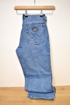 A 1980s-1990s pair of Wrangler denim jeans, having the classic five-pocket design, waist measuring 15' across laid flat, hips 40', inside leg 29'. Good condition, subtle signs of age often desirable and typical of vintage denim.