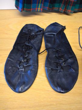 A vintage collection of traditional Scottish dance clothing, paraphernalia, and documents, comprising a 1971 Shetland Industries Keswick wool kilt, in green, blue, black, orange and yellow, 32' waist and 26' long, with a silver Cameron clan kilt pin attached, brown leather sporran containing three copied of 'Scottish Country Dances in Diagrams Fifth Edition', inside each an invitation to the Wedding of John & Beryl or to a Lake District Scottish Dance event, a tan leather belt with ornate gold metal buckle, two pairs of black leather dance slippers approx size 7-8 and another pair approx size 3-4, on a cloth case ansa denim bag with a white mock bamboo handle. All in good used condition.