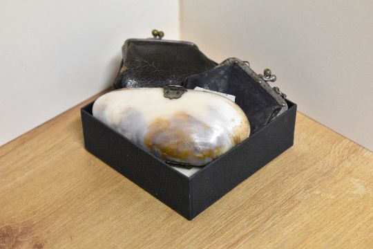 A collection of Victorian womens accessories. A mother of pearl oyster shell purse, in whoe shell form having metal hinges and clasp, with typical red lining and pockets constructed within. A pair of antique clogs, black leather uppers, significant age to the metal fixings, approximately women's size 4. Along with two miniature ladies' purses in leather.