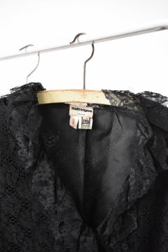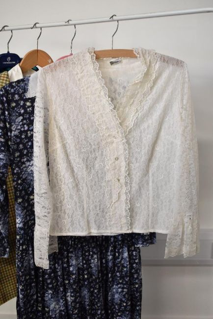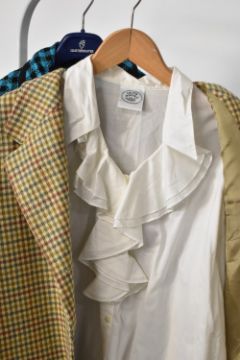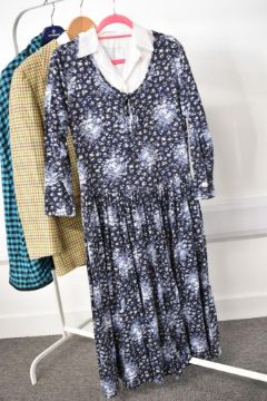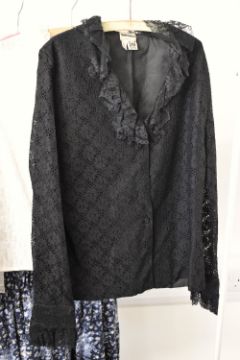 Seven pieces of 1970-80s womenswear, including three Laura Ashley garments. A Laura Ashley navy floral smock dress in heavy jersey with bottons and half sleeves, size 10. A Laura Ashley gingham check blazer in yellow, teal and browns Pure New Wool, size 16. A Laura Ashley cream cotton blouse featuring a ruffled chest, size 18. A white short sleeved summer blouse with scalloped embroidered collar and decoration, no labels, size S-M. A Wardo cream lace sheer shirt, V neck, ruffle sleeves, size 33-34'. A Selfridges black lace shirt with ruffled V-neckline, size 36. A cape coat in turquoise and black gingham check, lined thickly and having triple whorl duffel ties, size XS-S.