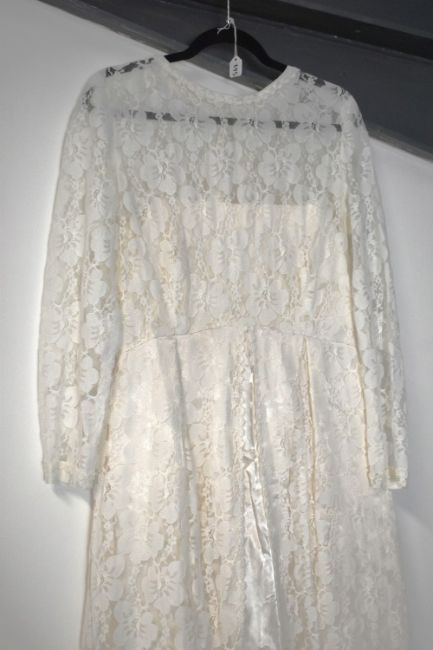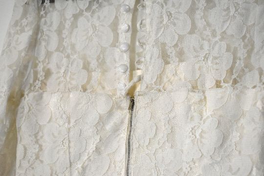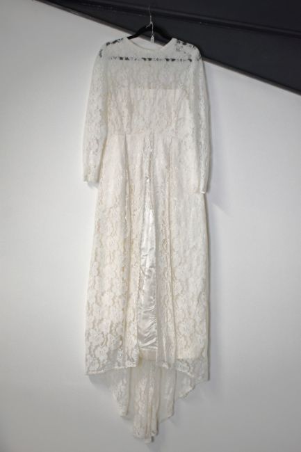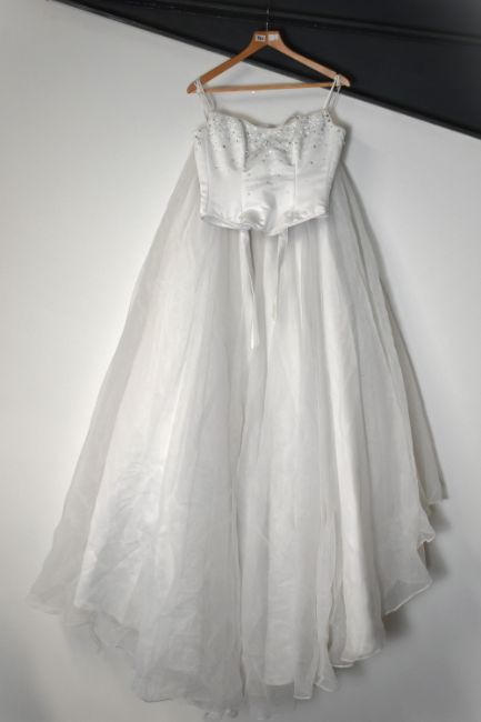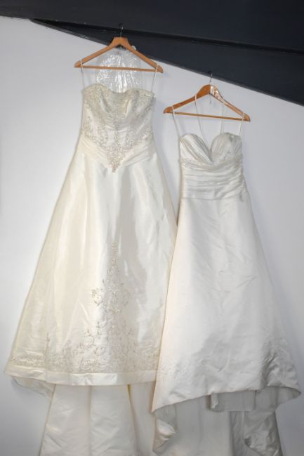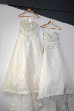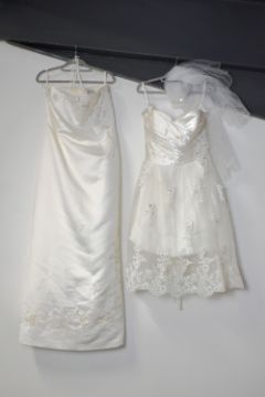 Six modern wedding dresses, having various cuts and styles, mostly with embellishment, comprising a two-piece example, three strapless styles having sizable trains, a long-sleeved lace example, and a short style, including two shawls and a veil headband. Sizes range from S-XL. Some showing signs of wear such as marks, scuffs, loose threads to the lower parts of the skirts.