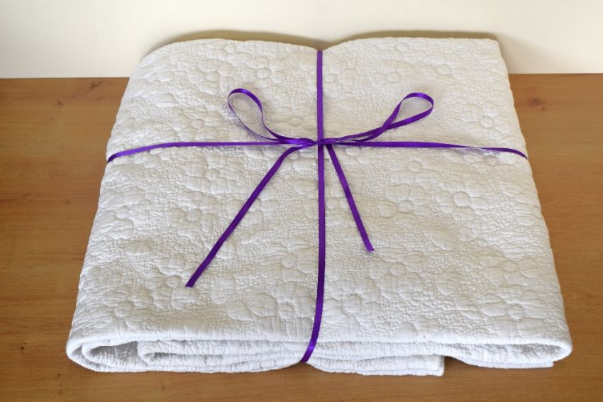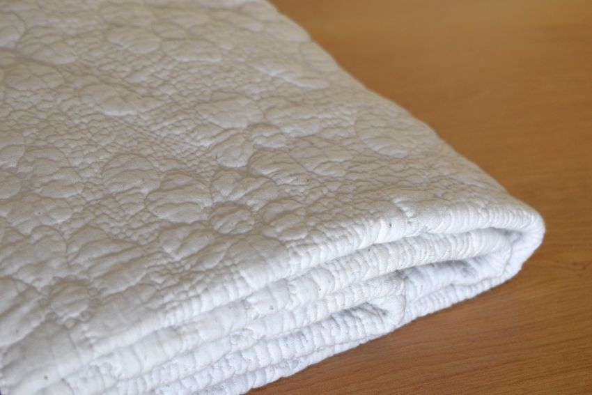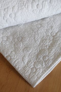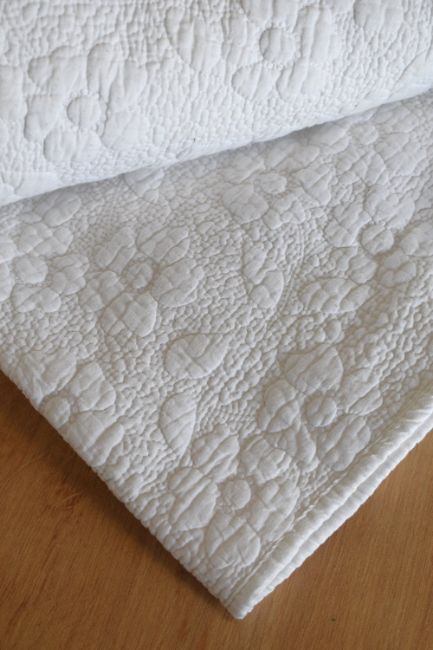 A 1960s-70s Cynthia Rowley Mandalay bedspread, in white cotton, having an all over floral quilting threadwork treatment. 100% cotton, some bobbling due to age and use.