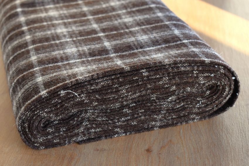 A bolt of 100% Jacobs wool tweed, brown with cream tartan check Pattern No. J7, 6m long and 150cm (60 inches) wide. Tag still attached reads: 'Jacobs Wool' and bears the Pure New Wool stamp mark.