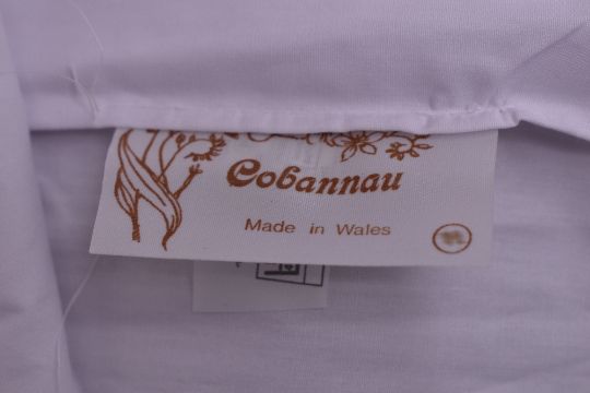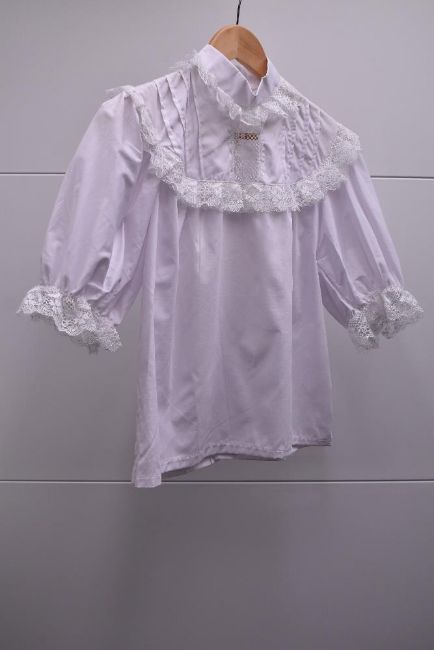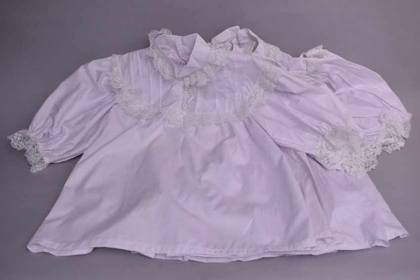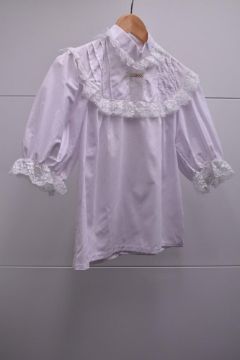 Four 1970s Cobannau white cotton blouses, from the Welsh factory known for the style, which closed in 1980. Each button down blouse having press-pleat and lace yoke, with lace trim around the grandad collar, and wide pleated puff sleeves. All size Small, new and unworn.