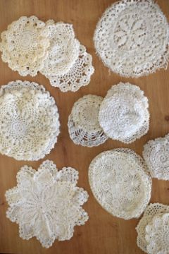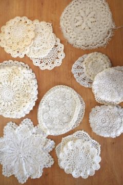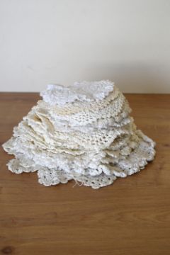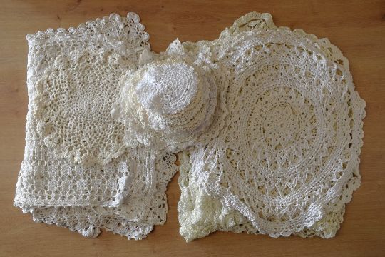 A collection of 20th century crochet doilies, in shades of off-white, having various knot patterns, shapes and sizes. One rectangular table covering or table runner, measuring 48x26'. Collection includes rectangular surface protectors, the largest being 22' long, circular coasters and place mats, ranging in size from 3' to 17' diameter.
