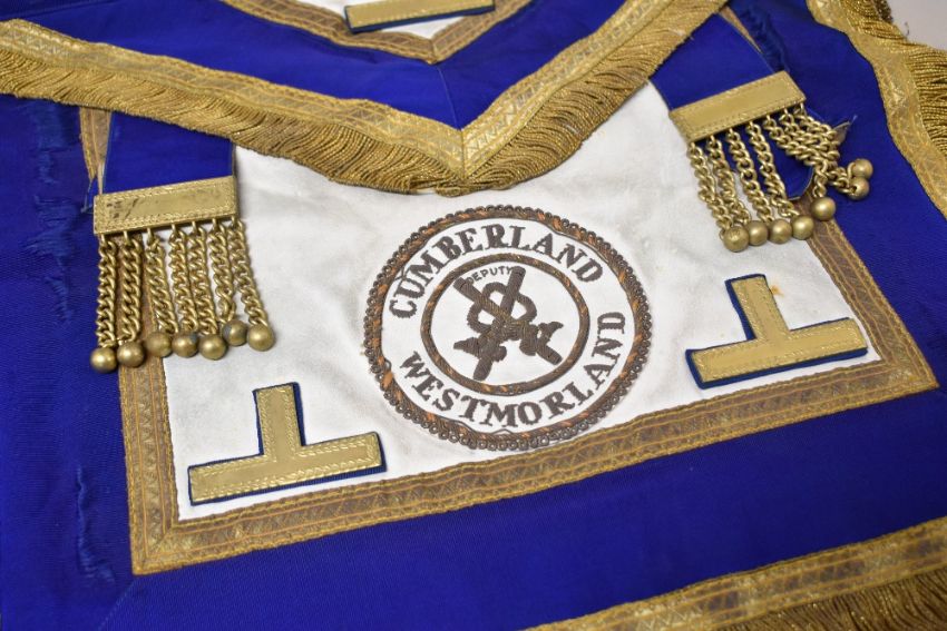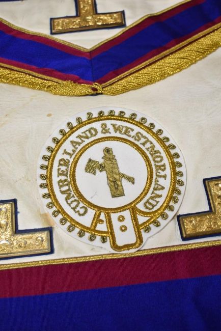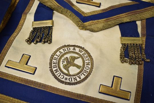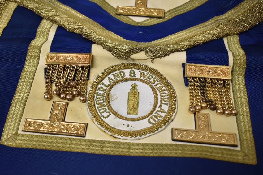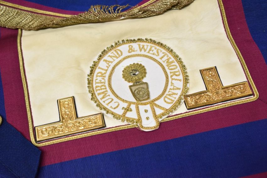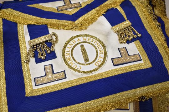 Seven pieces of local interest Masonic Regalia comprising six Westmorland and Cumberland district aprons and a sash.