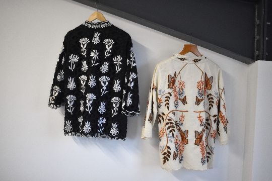 Two 1960s-1970s The Foreign Look embroidered jackets. A Black cotton jacket with intricate vut-out design, and white floral and foliate ambroidery throughout, having a mandarin collar and scalloped hems. A cream mandarin-collar jacket featuring 3D embroidered butterfly applique detail, and all over floral embroidery in autmnal warm browns, peach, pink and blue. Both size 12, very good condition.