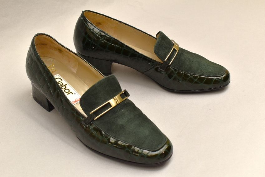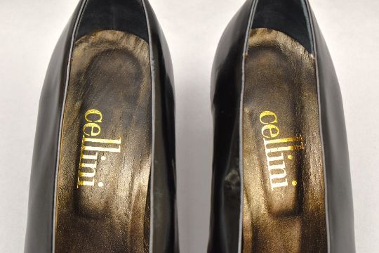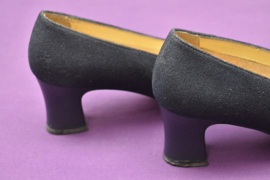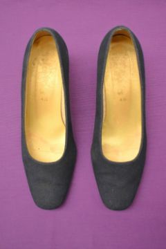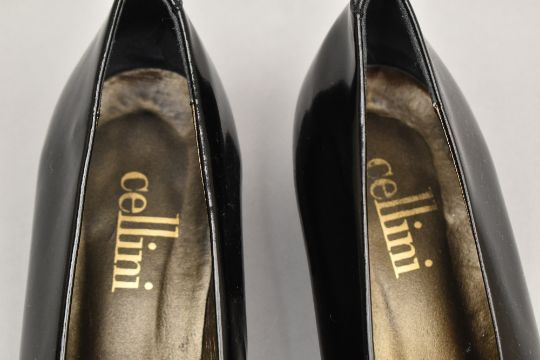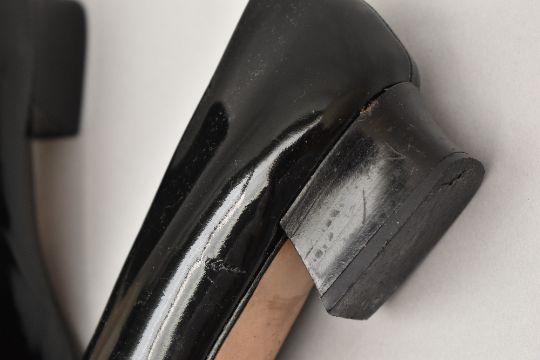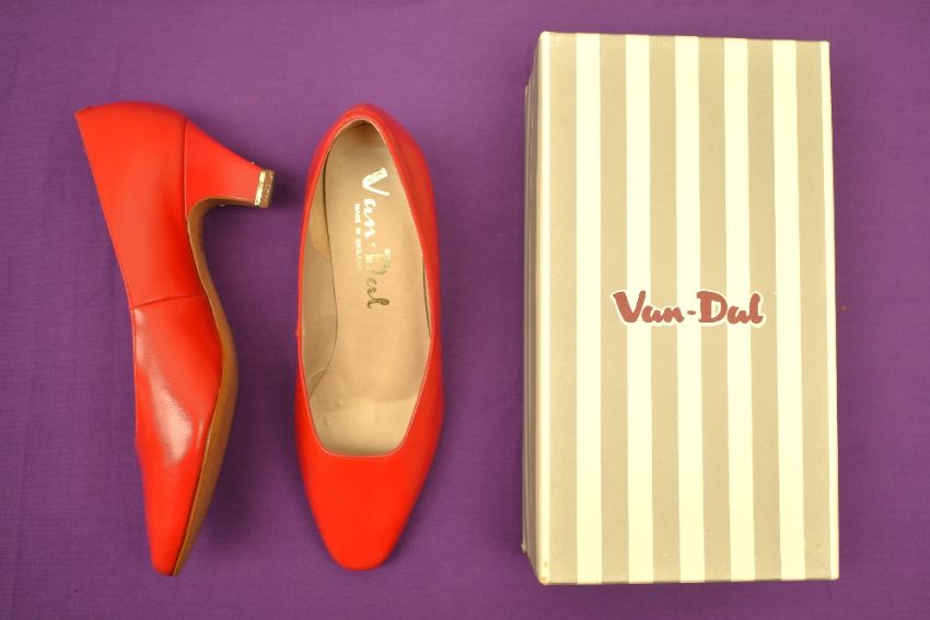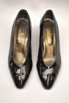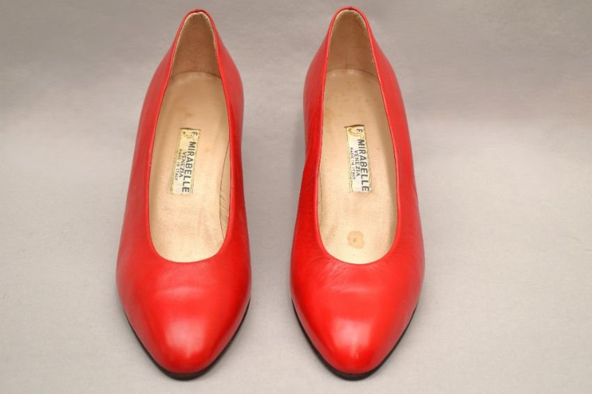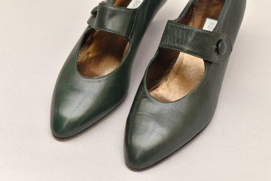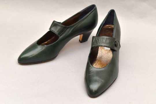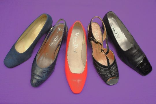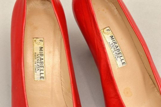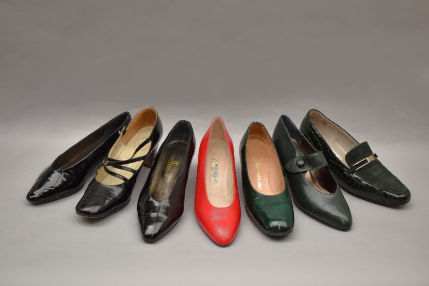Sixteen pairs of 1940-1990s womens formal or evening shoes. Mostly leather a range of attractive colours such as forest green and pillar box red, patent examples, some Italian made examples. A range of sizes, 4.5-7.5, conditions pictured.