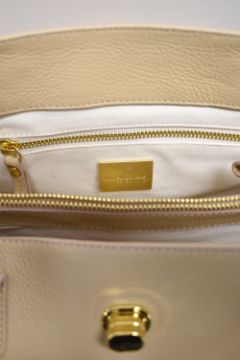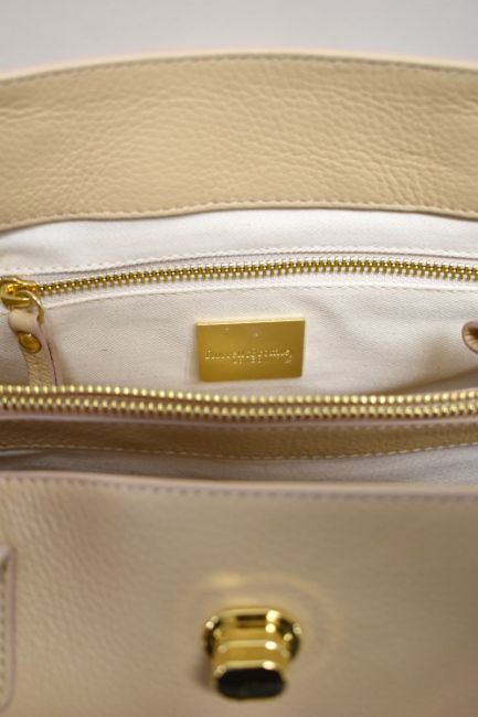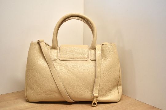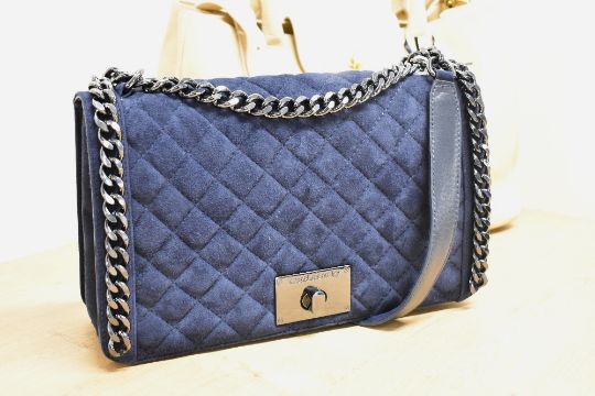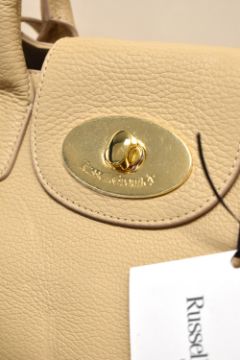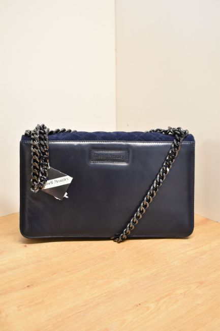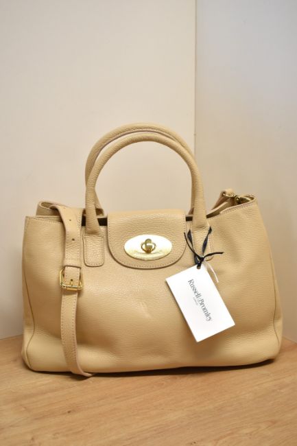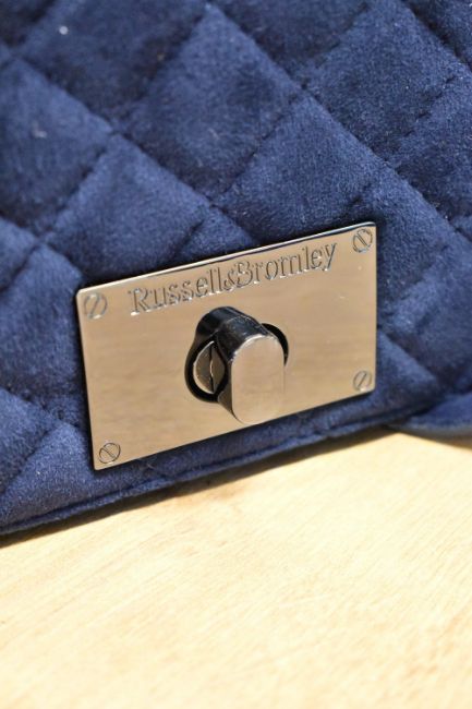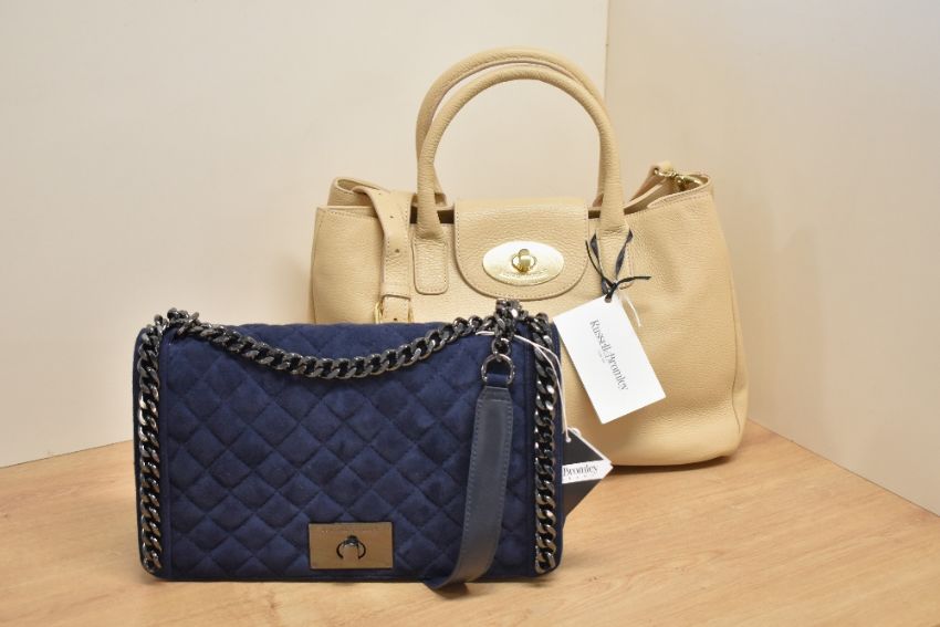 Two Russel & Bromley leather handbags in lovely condition. A 'CHAINY' cross-body bag in navy Nappa suede, quilted front, black metal hardware and chain trim, Nappa leather back panel, tags intact, appears lightly worn, 7.5x11.5'. A 'SMYTHETOTE' top-handle bag in nude textured leather, goldmetal hardware, matching leather cross body detachable strap, tags intact, unused, W15.5'xH10'xD5'.