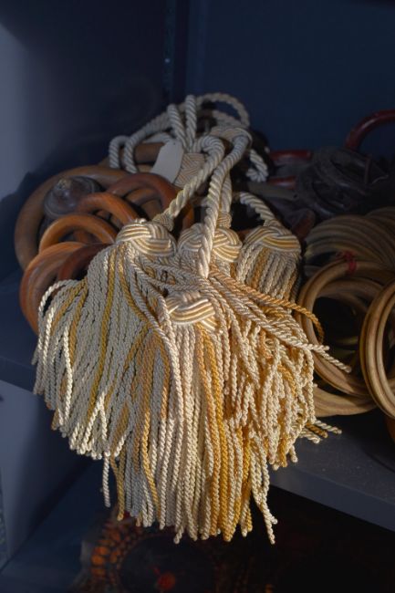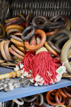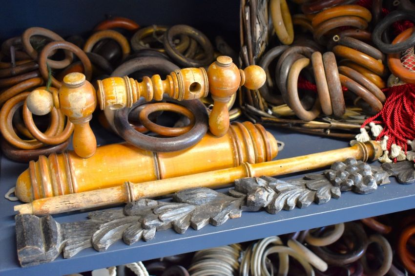A quantity of antique wooden curtain hoops / rings, and carved woodwork fixings, various sizes including 3' diameter and 5' diameter rings.