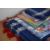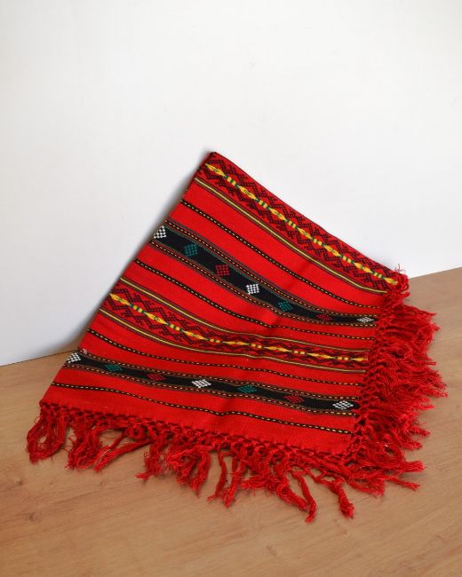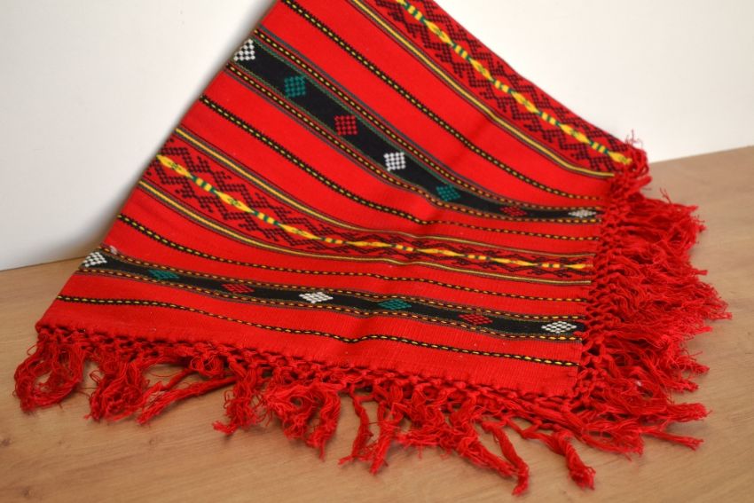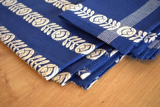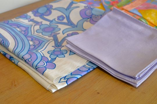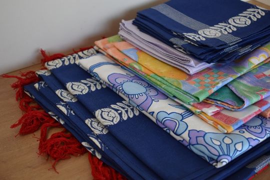A quantity of various tablecloths and place settings, including a 1960s-70s cornflower floral graphic style, a blue woven country style, a gold sparkle festive set, a 1980s-90s fruity floral set, and a red woven tartan cloth.