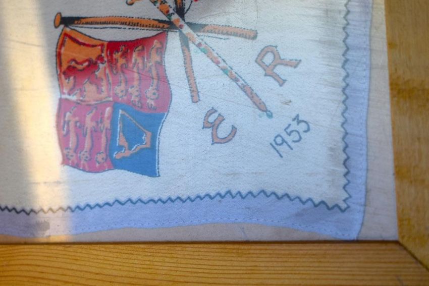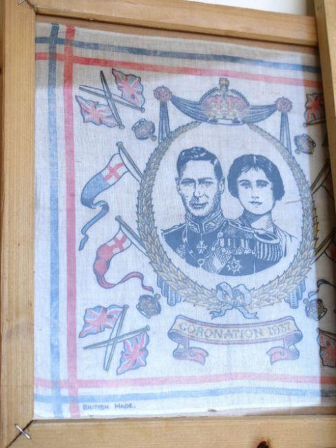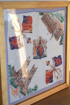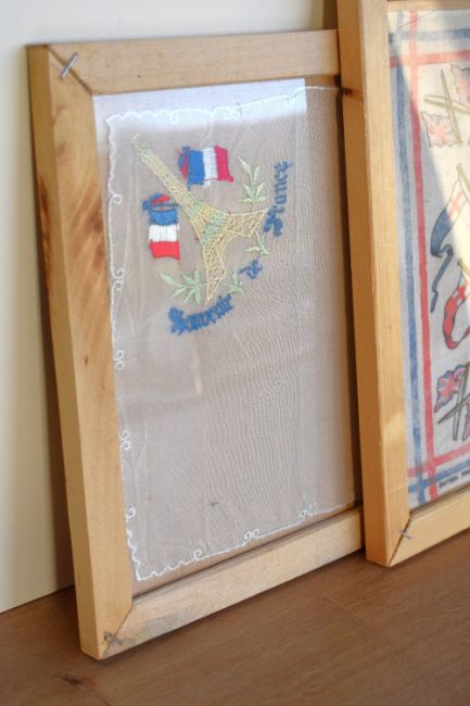 Three framed 20th century handkerchiefs. A 'Souvenir de France' white mesh / lace handkerchief with embroidered edging, having an embroidered Eiffel Tower, French flags and lettering in red, cream, blue threads with a green foliate motif, 8x8', frame 9.9x9.9'. A 1937 George VI Coronation handkerchief, 9x10', frame 11.2x11.2'. A 1953 Elizabeth II Coronation handkerchief, 11x11', frame 13x13'.