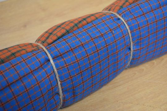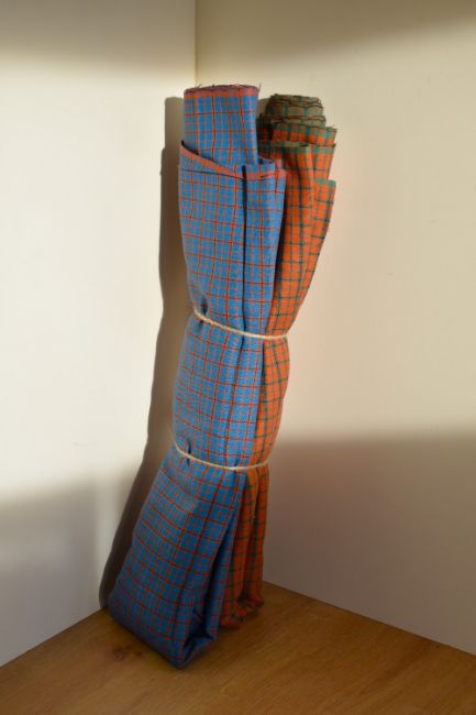 Two bolts of fine wool tartan fabric, one mostly blue with orange/red and black check, the other being red/orange with green and black check, both are 3ft wide and approximately 100'' length.