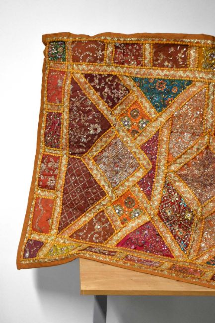 A vintage wall hanging in the African / Middle Eastern style, having yellow-orange, brown, red and azure background panels overlaid with intricate embellishment and embroidery in gold, silver and plastic gemstones. Very good condition, 40x60'.