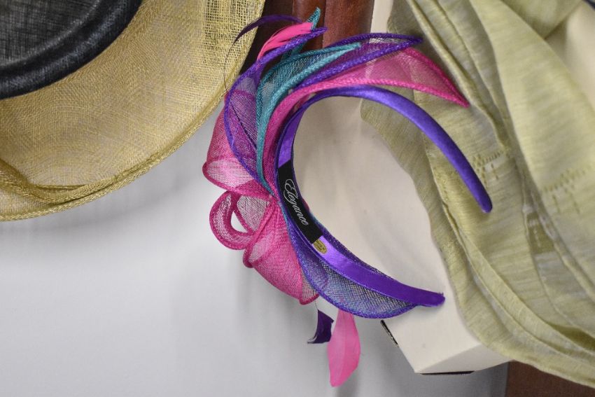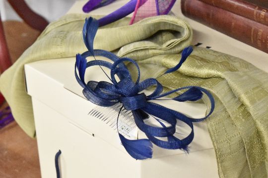 A collection of modern wedding accessories, comprising a wide Viyella hat in navy and neutral woven hat with large bow detail, along with three fascinators, one of which is a headband in purple, pink and teal, and the other two are french comb fascinators, a navy and a green with a matching pashmina. Excellent conditon, like new.