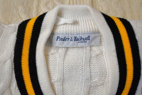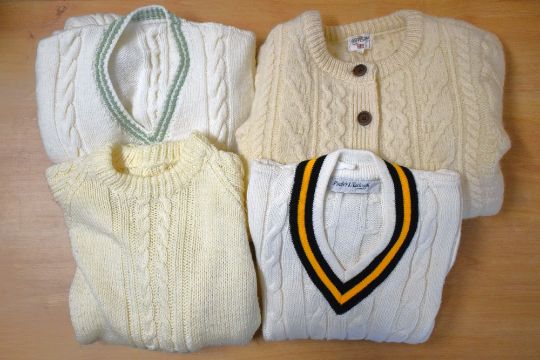 Four peices of 1970s childrens knitwear in cream, comprising a unisex cable-knit crew-neck cardigan with wooden buttons, XS, and jumper, approx aged 10-11, and two cricket sweaters with coloured V-necks, approx ages 7-10.